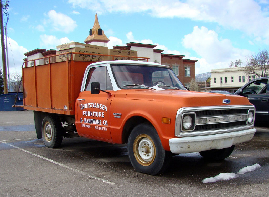 The 1969 pickups had a redesigned grille featuring a wide, horizontal aluminum grille bar with the Chevrolet name prominently displayed and a more upright hood. The 327 c.i. V-8 engine was enlarged in 1969 to 350 CID (piston stroke increased .23") with a net horsepower rating of 195-200 hp. Some internal cab changes were also made, most notably the switch from a hand-operated parking brake to a foot pedal, and a more modern looking two-spoke steering wheel with plastic horn button replaced the previous year's three-spoke wheel with chrome horn button. Also new this year were upper and lower side moldings, which added another two-tone paint option.