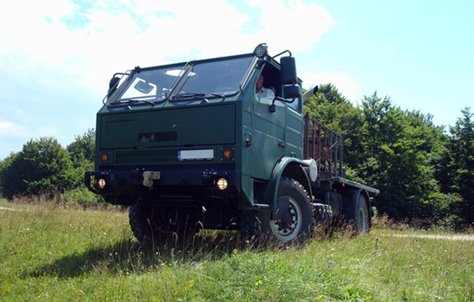 Since 2004, the range of DAC military vehicles were produced under the brand name Roman. Preserving the appearance like the very first trucks in 1977, they were highly evolved technically and got new modifications. The range includes two-axle trucks FAEG and 3-axle DFAEG. Both versions are equipped with single off-road tires on all axles. Angular cabin now may be in an armored version. As the power plant is used the engine MAN D 0834 or D 2866 with a power of 206-410 hp. In addition to flatbed trucks a military lineup includes 122 mm missile launcher on the 26.410DFAEG chassis, truck for loading of containers and transportation of 122 mm rockets on the 26.360DFAEG chassis, the mobile air sounding station on the 22.310DFAEG chassis, lightweight container transporter on the 2-axle 14.206FAEG chassis, fuel and water tanks and some other modifications.