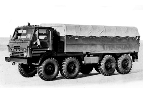 A 7-ton floating version Ural-53221 (5322P) was made in 1978 on the chassis of Ural-5322 truck. On the water this truck could be used without additional floats and moved by propellers and rotating of all wheels. Two propellers are located under the rear of the flatbed platform and receive torque from a tranfer gearbox. In general, 4-axle Ural-53221 was identical to a 3-axle version Ural-43221A. Wheelbase - 1400 + 2750 + 1400 mm. Maximum speed - 80 kph. Range - 750 km. Fuel consumption - 40 l/100 km. Engine - diesel YaMZ-741 V10 260 hp and 765 Nm. Transmission - 5-speed manual with a 2-speed transfer gearbox.