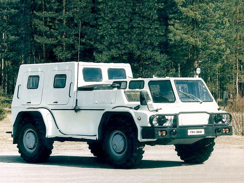 Intended for use as the base for mounting various types of armaments and materiel (large-caliber small-arms and light artillery and antiaircraft rocket weapon systems). The vehicle’s welded body has two detachable modules (the front one and the rear one). The front module includes a power compartment and a control compartment divided with a leak-tight partition. The GAZ-3937 truck has a two-seat module with the commander seat being behind the driver seat. There are dou-ble-leaf manholes for embarkation and disembarkation.