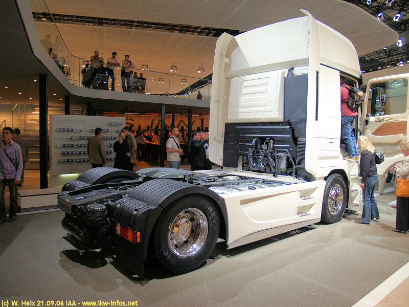 На IAA-2006 был представлен концепт Actros Space Max, над которым по просьбе мерседесовцев поработал некий голландский дизайнер Бернтран Янсен. Вместо серийной высокой крыши на концепте еще более высокая надстройка из стеклопластика (высота от земли до ее крыши — аккурат разрешенные 4 метра). В придачу к уже знакомому по Actros Cruiser паркетному полу появились вставки из орехового дерева в дверях и на панели. На белых рельефных стенах теперь ютятся маленькие светильники , а на пол вместо сиденья сменщика водружено одноногое вычурное кресло — качающееся и вертящееся. Кровать, к счастью, все же осталась — правда, всего одна, верхняя. В «походном» положении она поднята и утоплена, а на стоянке опускается с помощью электрогидравлического привода.